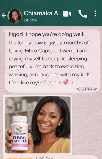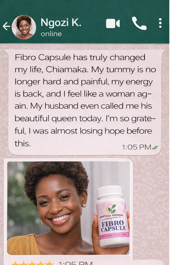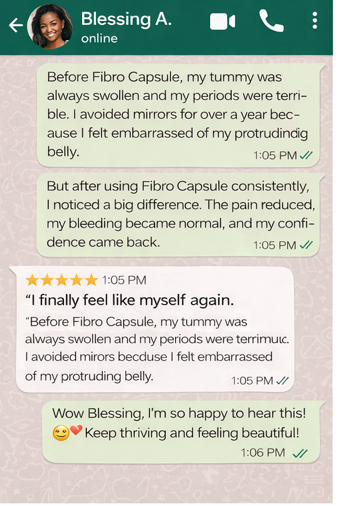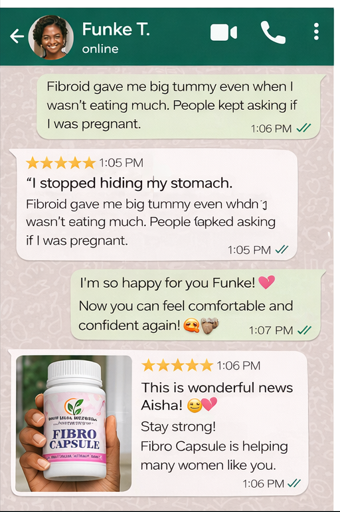 “Fibroid gave me big tummy even when I wasn’t eating much. People kept asking if I was pregnant. After using Fibro Capsule consistently, the bloating reduced and I feel lighter. I can now wear fitted clothes without shame.”