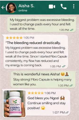 “Before Fibro Capsule, my tummy was always swollen and my periods were terrible. I avoided mirrors because I felt embarrassed. After consistent use, the pain reduced, my bleeding became normal, and my confidence came back. I can dress well again.”